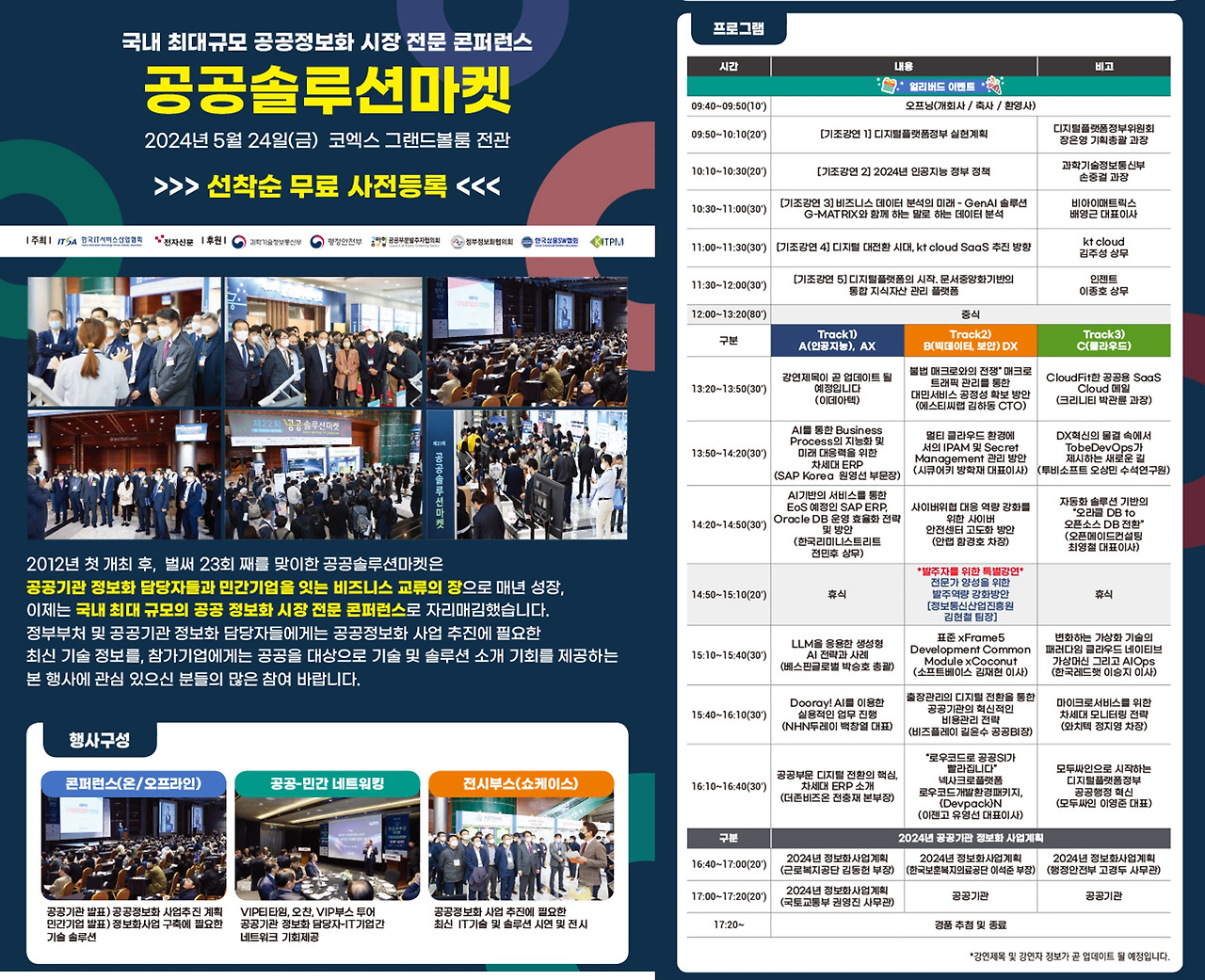 | 제24회 공공솔루션마켓 - 2024년 11월 22일(금) 코엑스 그랜드볼룸 (0) | 2024.11.12 |